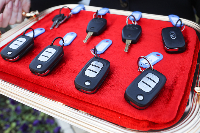 Валентина Матвиенко передала ключи от восьми новых автомобилей производства «АвтоВАЗ» представителям российско-таджикистанских образовательных учреждений. Фото: Парламентский фотоархив/ Пресс-служба СФ